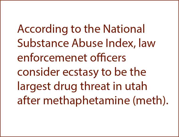 According to the National Substance Abuse Index, law enforcement officers consider ecstasy to be the largest drug threat in Utah after methamphetamine (meth). Thus, being found with ecstasy carries severe consequences, even if the amount is small. Many people are surprised to learn that possession of even less than one tablet of ecstasy can be charged as a felony.
