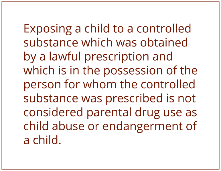 Exposing a child to a controlled substance which was obtained by a lawful prescription and which is in the possession of the person for whom the controlled substance was prescribed is not considered parental drug use as child abuse or endangerment of a child.