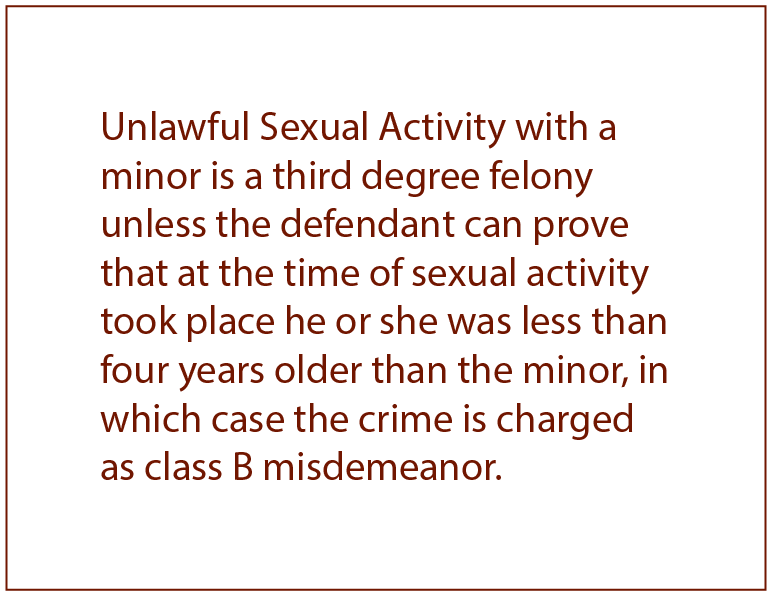The three general crimes are Unlawful Sexual Activity with a Minor, Sexual Abuse of a Minor, and Unlawful Sexual Contact with a 16 or 17 Year Old. Under all three of these categories the minor does not object to the sexual activity. If the sexual activity happens against the minor’s will, the crime is more likely to be charged as rape, forcible sodomy, aggravated sexual assault, or object rape, depending on the circumstances.