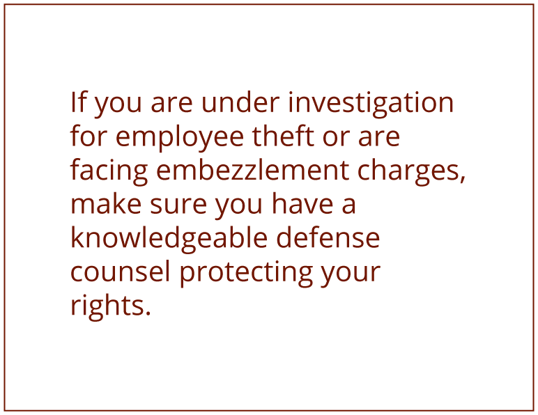 If you are under investigation for employee theft or are facing embezzlement charges, make sure you have a knowledgeable defense counsel protecting your rights. Even for a minor misdemeanor charge, a conviction will mean you face a lifetime of doubt by future employers checking your background.