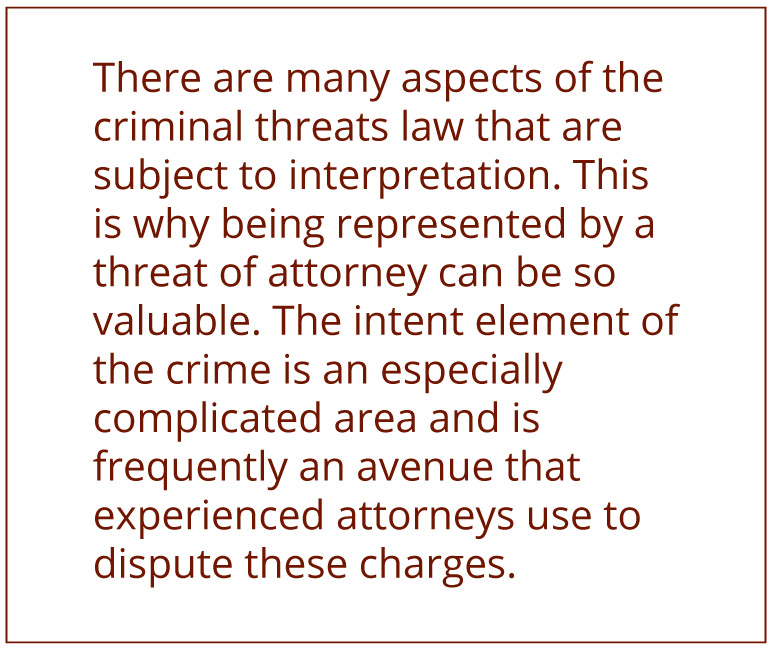 There are many aspects of the criminal threats law that are subject to interpretation. This is why being represented by a threat of attorney can be so valuable. The intent element of the crime is an especially complicated area and is frequently an avenue that experienced attorneys use to dispute these charges. While the state does not need to prove that you intended to carry out the threat — or that you were even capable of doing so — it does need to prove that you intended for the threat to be taken seriously and to place the target in imminent fear of injury, death or substantial property damage.