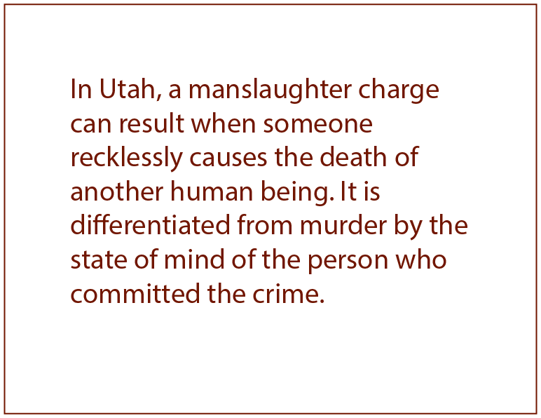 In Utah, a manslaughter charge can result when someone recklessly causes the death of another human being. It is differentiated from murder by the state of mind of the person who committed the crime. Where a murder is committed intentionally, manslaughter is committed recklessly, meaning the person generally knows that their actions could potentially cause danger to others, but they choose to ignore that risk. For example, setting off fireworks inside a crowded building could be classified as a reckless action.