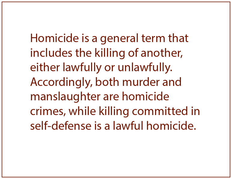 Each experienced defense attorney at Intermountain Legal has tried numerous homicide cases, and understands the thorough preparation and steadfast focus required to obtain a favorable result in the face of these serious charges. Homicide is a general term that includes the killing of another, either lawfully or unlawfully. Accordingly, both murder and manslaughter are homicide crimes, while killing committed in self-defense is a lawful homicide. Please see our manslaughter and violent crimes pages for more information about these crimes and the penalties associated with each.
