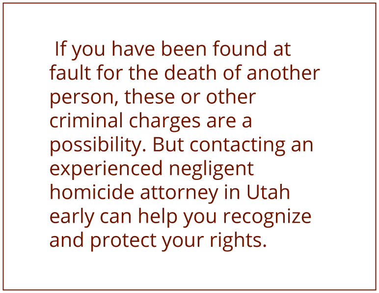 Utah law defines negligent homicide as acting with criminal negligence and thereby causing the death of another person. It is a Class A misdemeanor that can carry penalties of up to one year behind bars and up to $2,500 in fines. Moreover, when negligent homicide involves an automobile accident, the guilty party can have his or her driver’s license revoked. While not as serious as automobile homicide — which involves causing a death while driving under the influence and is at least a Class 2 felony — it is still a very serious matter deserving the attention of a skilled lawyer.