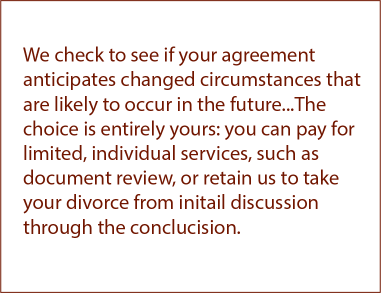 Intermountain Legal can give you as much or as little help with your uncontested divorce as you desire. You may have a very modest marital estate and only need to have some paperwork drawn up. You may have drafted papers and simply want an attorney to review their contents. Intermountain Legal reviews divorce documents for clarity and completeness. We check to see if your agreement anticipates changed circumstances that are likely to occur in the future. If you’ve only just begun your settlement discussions, we can represent you in proposing terms and negotiating a settlement. The choice is entirely yours: you can pay for limited, individual services, such as document review, or retain us to take your divorce from initial discussions through to conclusion.