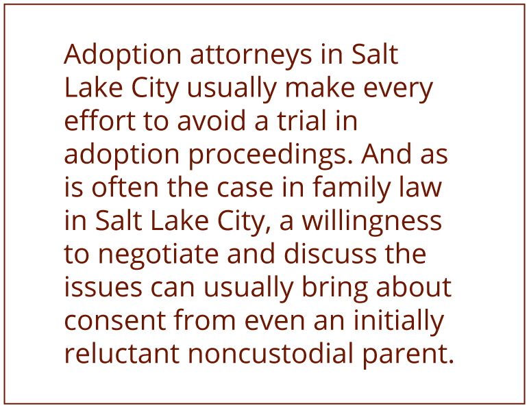 Adoption attorneys in Salt Lake City usually make every effort to avoid a trial in adoption proceedings. And as is often the case in family law in Salt Lake City, a willingness to negotiate and discuss the issues can usually bring about consent from even an initially reluctant noncustodial parent. As knowledgeable attorneys, we at Intermountain Legal fully understand the issues that can occur during adoption proceedings and know how to avoid them. While we try to avoid litigation in adoption cases — and usually succeed in doing that —, we are prepared to go to trial when necessary.