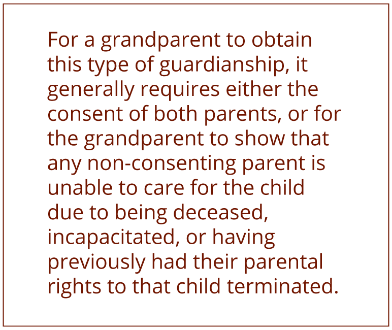 The quickest and easiest way for a grandparent to establish custody of a grandchild is through a guardianship. Once established, a guardianship gives the guardian custody rights over the minor child and allows them to make important life decisions on behalf of the child as though the guardian was a parent. For a grandparent to obtain this type of guardianship, it generally requires either the consent of both parents, or for the grandparent to show that any non-consenting parent is unable to care for the child due to being deceased, incapacitated, or having previously had their parental rights to that child terminated.